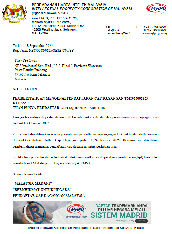 The successful registration grants SEM Equipment Sdn. Bhd. exclusive rights to its trademark, reinforcing the company’s brand identity and ensuring legal protection under Malaysian intellectual property laws. This achievement underscores the company’s commitment to professionalism, authenticity, and long-term business sustainability. Registering the trademark is a significant step forward for the company, which could reflects the company's dedication to protecting their brand while continuing to deliver trusted products and services to all the customers.